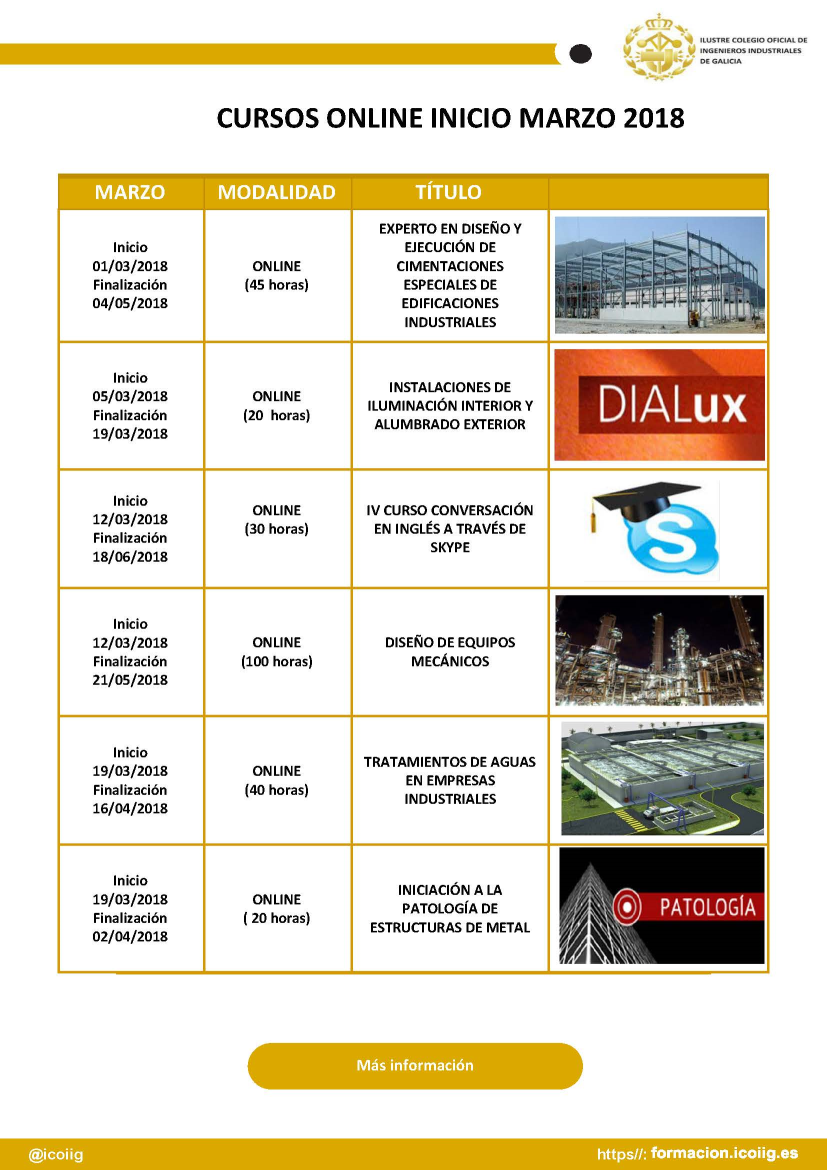 El "Colegio de Ingenieros Industriales de Galicia (ICOIIG)" ens ha fet arribar el seu calendari de formació a distància al qual nosaltres podem accedir amb un descompte per estar col·legiats al COETGME.